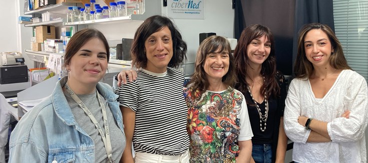 (*) Coral López Fonseca (Derecha) y Ana Simón García (Izquierda), dos de las primeras firmantes del estudio, con su compañera la Celia López Menéndez investigadora colaboradora, y las líderes del trabajo Teresa Iglesias, del IIBM (CSIC-UAM) y jefa de grupo CIBERNED, y Eva Porlan, del CBMSO (CSIC-UAM).